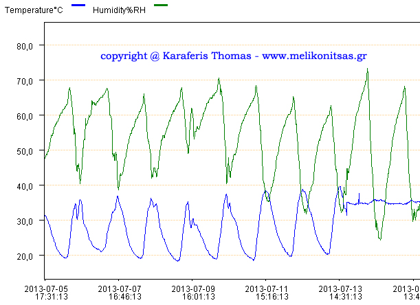 Παρατηρήστε την θερμοκρασία από την στιγμή που άλλαξε θέση ο αισθητήρας και τοποθετήθηκε σε πλαίσιο γόνου. Αυτή δεν αλλάζει παρά μόνο κάποια δέκατα από τους 35 βαθμούς κελσίου. Κατά τη διάρκεια των προηγούμενων ημερών η θερμοκρασία στο εσωτερικό της κυψέλης είχε διακύμανση από 18 περίπου βαθμούς ως και κοντά στους 40! Στην γονοφωλιά όμως η θερμοκρασία παραμένει κοντά στους 35 ανεξάρτητα από το αν είναι καλοκαίρι ή χειμώνας. Στην περίπτωση που εξετάζουμε σε αυτό το άρθρο προφανώς οι μέλισσες πρέπει να δροσίσουν την κυψέλη τους καθώς αυτή κατά τη διάρκεια της ημέρας ξεπερνά τους 40 βαθμούς. Ένας τρόπος για να γίνει αυτό είναι να εφαρμόσουν αερισμό. Αν όμως με αυτή την μέθοδο δεν είναι εφικτή η πτώση της θερμοκρασίας θα αναγκαστούν να βγούνε αρκετές έξω ώστε να πετύχουν το σκοπό τους και εμείς αυτό το βλέπουμε με την μορφή της γενειάδας.