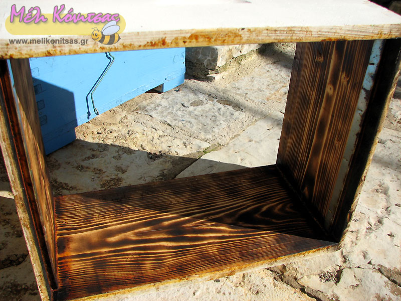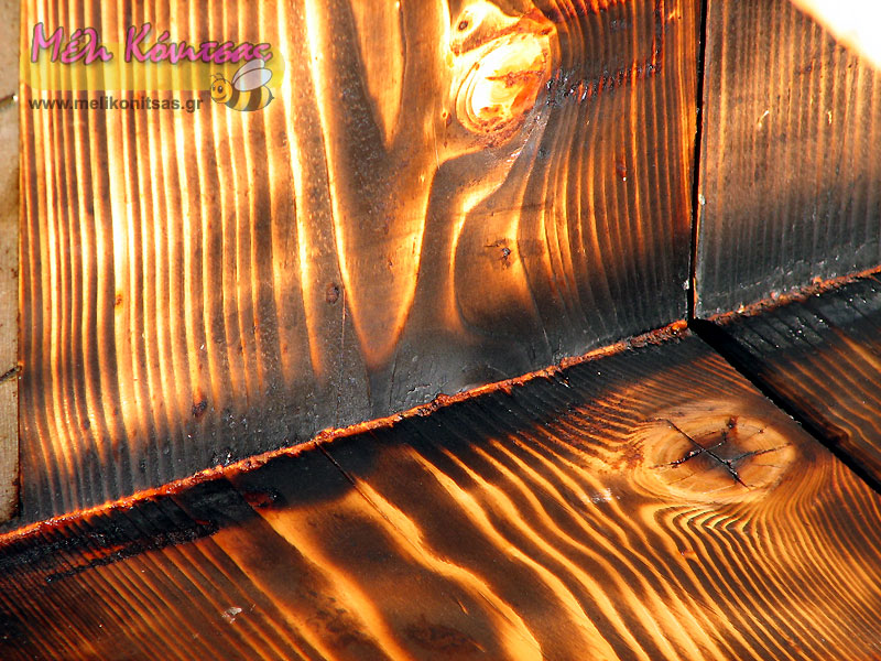 Στο πρακτικό κομμάτι τώρα, για τον μελισσοκόμο αποτελεί μια σχετικά δύσκολη και χρονοβόρα εργασία, αλλά πιστεύω φθηνή και αποτελεσματική. Πράγματι θέλει υπομονή και χρόνο. Πρέπει πρώτα να ξυθούν όσα περισσότερα κομμάτια προεξέχουν και μπορούν να αφαιρεθούν ( κεριά , πρόπολη , σκουπίδια κτλ. ) έτσι ώστε η φλόγα να φτάσει όσο το δυνατόν κοντύτερα στο ξύλο. Το ξύλο σχεδόν αμέσως μαυρίζει, δείγμα ότι στο σημείο αυτό είναι έτοιμο. Σαν να ζωγραφίζει κάποιος περνά όλη την εσωτερική επιφάνεια της κυψέλης και αυτή “μαυρίσει” αναλόγως. Ειδική προσοχή και επιμονή πρέπει να έχουμε στις γωνίες και στη βάση που κάθονται τα πλαίσια. Σε αυτά τα σημεία μαζεύεται το περισσότερο υλικό, το οποίο μπορεί να περιέχει κάποια απειλή. Σε αυτό το σημείο πρέπει να πω ότι η μυρωδιά που βγάζει η καμένη πρόπολη είναι απίστευτη, μάλιστα όπως διάβαζα σε Αμερικάνικα φόρουμ βάζουν κομματάκια όταν καίνε στο τζάκι ή την φωτιά για να μυρίζει ο χώρος… Στην συνέχεια οι καμένες κυψέλες έχουν αρκετή κάπνα στην επιφάνεια του ξύλου. Αυτό φαίνεται εύκολα, όταν μεταφέρεις τις κυψέλες σου μαυρίζουν τα χέρια. Καλό είναι να μη μείνει αυτή η κάπνα μέσα γιατί ίσως είναι τοξική για τις μέλισσες οι οποίες θα θελήσουν να την καθαρίσουν. Είναι πολύ απλό και εύκολο με ένα μεγάλο σφουγγάρι ( την σκληρή του πλευρά ) και με λίγη σαπουνάδα να περάσουμε – ξύσουμε το εσωτερικό της κυψέλης και μετά με το λάστιχο να την πλύνουμε και να την αφήσουμε να στεγνώσει.