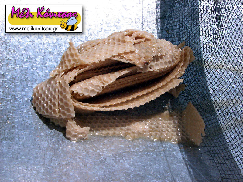 Η πρώτη δοκιμή έγινε με λίγα φύλλα κηρήθρας. Αυτά είχα πρόχειρα. Μια σίτα είναι απαραίτητη για να συγκρατεί τα “κουκούλια” και τα “σκουπίδια” γενικά και να μη καταλήγουν στο κερί μας. Μια λινάτσα ή κάποιο άλλο ύφασμα επίσης κάνει και μάλιστα επιβάλεται.