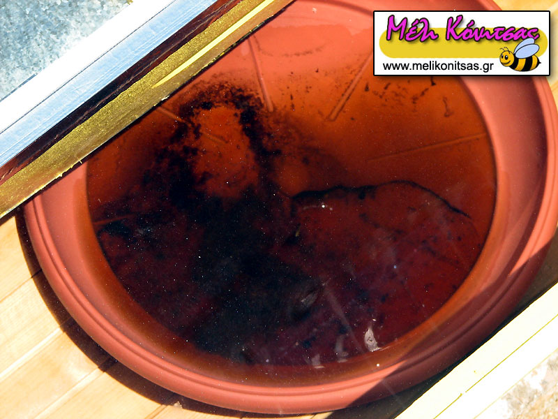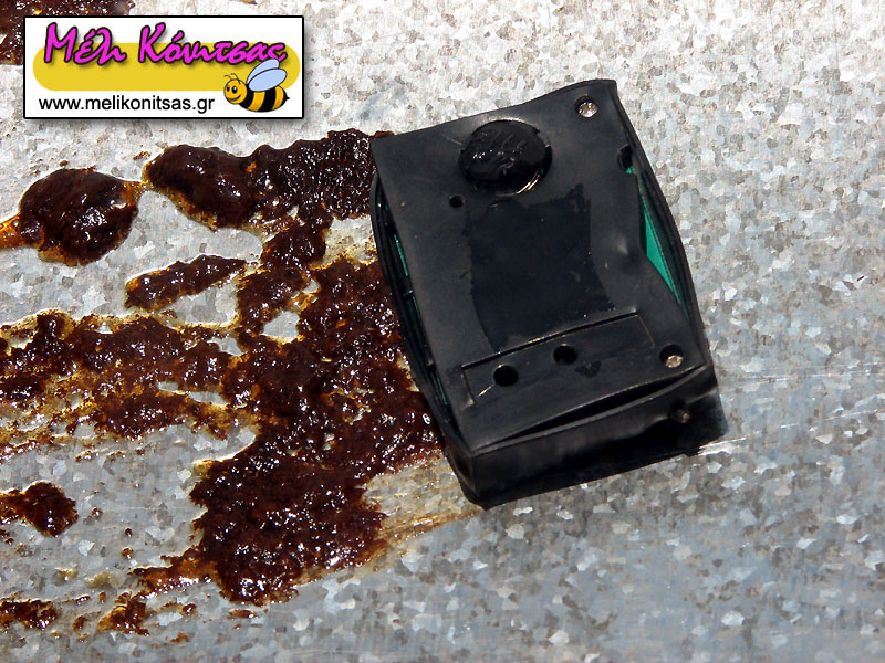 Επιστρέφοντας βρήκα το πιατάκι γεμάτο από το λιωμένο κερί. Γενικά σε πρώτη φάση το κερί δεν είναι καθαρό. Σκουπίδια και μέλι επίσης συγκεντρώνεται στο πιατάκι και θέλει καθάρισμα.