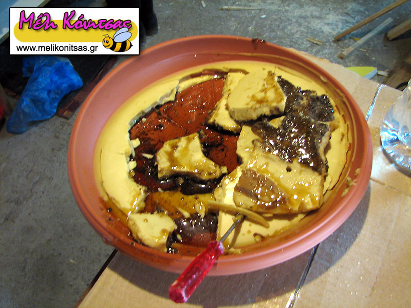 Σιγά σιγά το κερί… παραδίνεται! Φυσικά το κερί μέσα από κηρήθρες στις οποίες έχει εκτραφεί και γόνος είναι πιο δύσκολο να βγει και θέλει περισσότερο χρόνο.