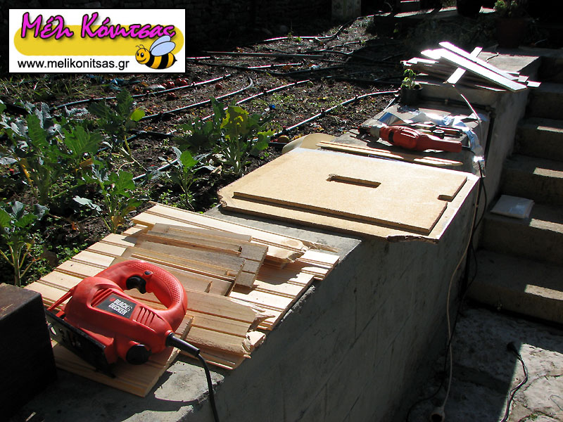 Στο κατασκευαστικό μέρος. Συνήθως δεν προτείνω την τέλεια λύση, απλά μια λύση που δουλεύει. Ειδικά στο κατασκευαστικό κομμάτι δεν έχω την πολυτέλεια να έχω πρόσβαση πάντα στα κατάλληλα εργαλεία. Πολλοί από εσάς θα είστε καλύτερα μαστόρια από εμένα και στο εκτελεστικό κομμάτι θα τα κάνετε τέλεια, όπως για παράδειγμα οι φίλοι μου οι ξυλουργοί! Το καπάκι χρειάζεται μια τρύπα για την τροφοδοσία και μια ακόμη για τον εξαερισμό. Αυτός είναι ο στόχος, διάφορες παραλλαγές μπορούν να γίνουν φαντασία έχει ο καθένας απεριόριστη. Στην παρούσα περίπτωση βρήκα κάποια ρετάλια ξύλα κόντρα πλακέ ( απλό ) που ήταν σχεδόν για πέταμα. Ήταν όμως λίγο μεγαλύτερα από τις διαστάσεις της κυψέλης οπότε μπορούσα να τα φέρω στα μέτρα.  Μια ηλεκτρική σέγα για μένα ήταν αρκετή. Χωρίς μεγάλη λεπτομέρια ( για την οποία οι μέλισσες συνήθως αδιαφορούν ) έκοψα τα καπάκια στις διαστάσεις της κυψέλης. Στην συνέχεια άνοιξα μια τρύπα στο κέντρο ώστε να μπει το πριονάκι της σέγας και να αρχίσει την τρύπα για την τροφοδοσία. Στη συνέχεια στην μια πλευρά ( ας πούμε μπροστινή ) έκοψα μια περιοχή περίπου 2,5 Χ 2,5 εκατοστά.