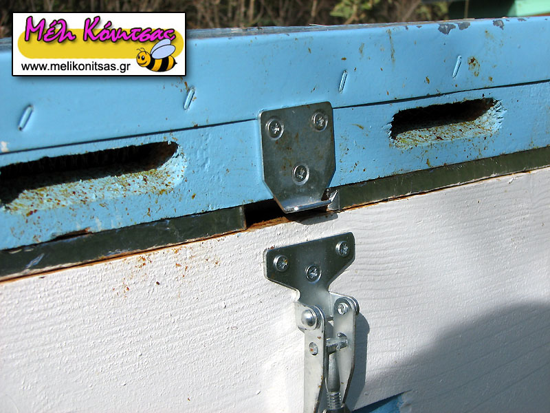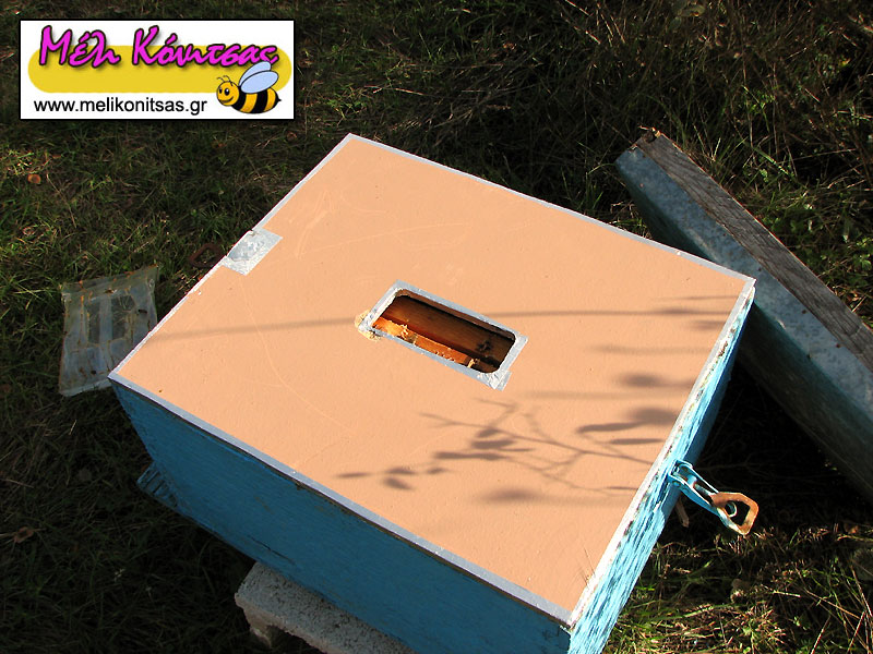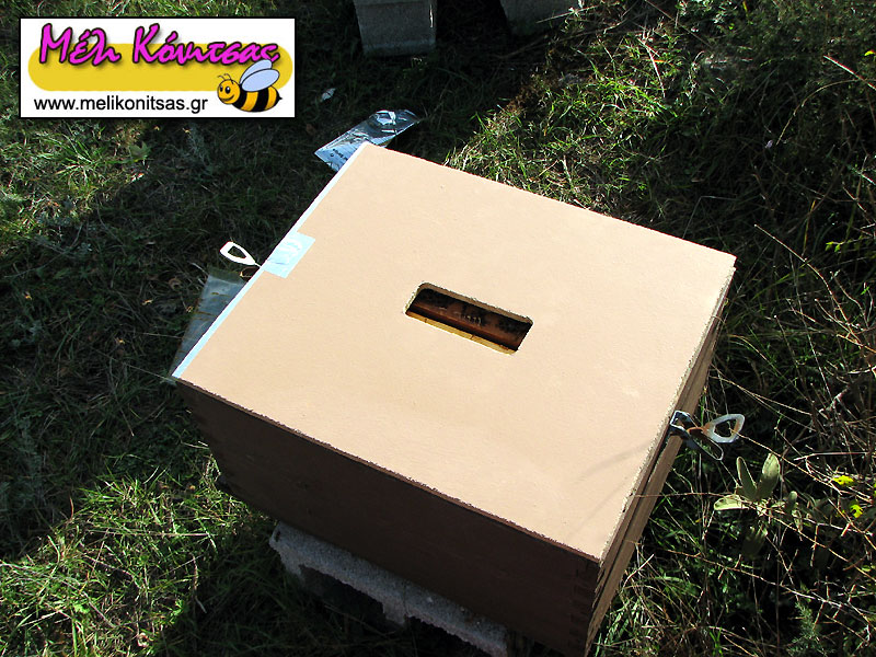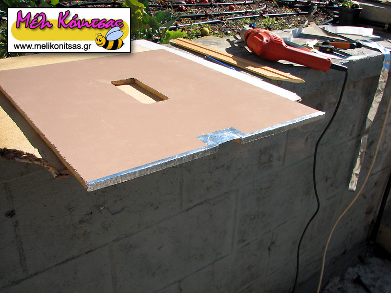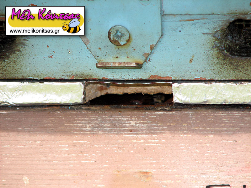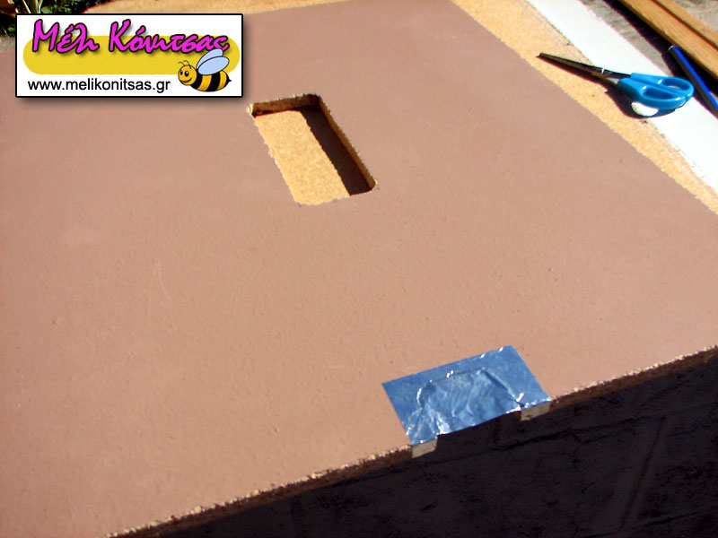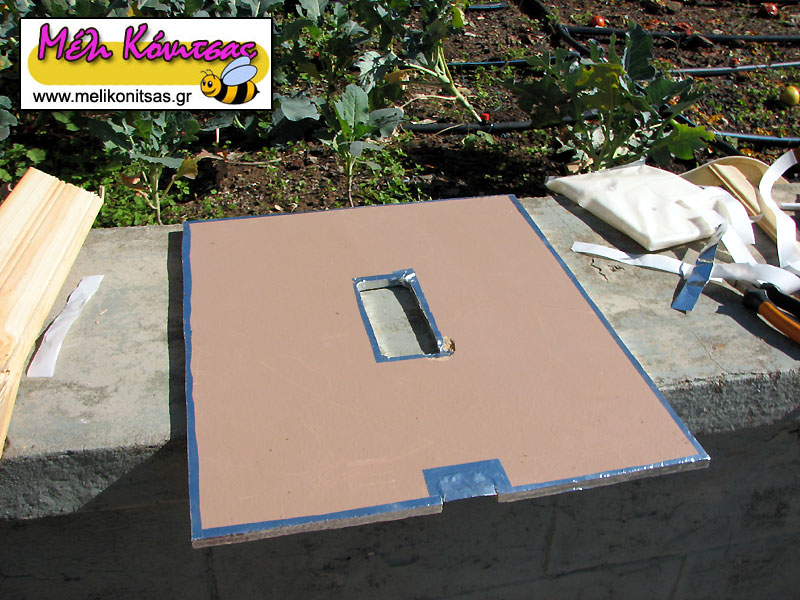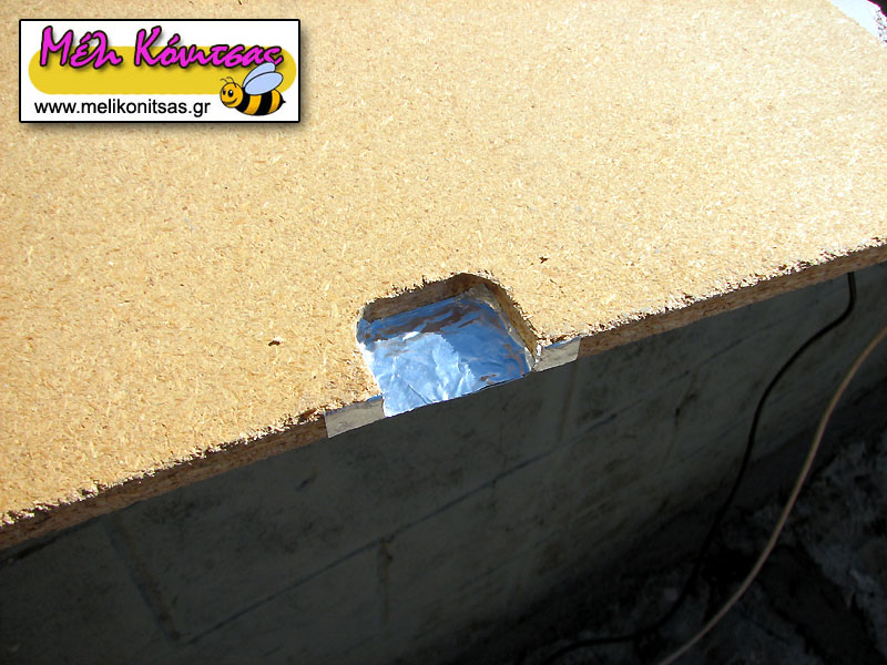 Γιατί τόσο ? Δεν θέλω η πάνω είσοδος – εξαερισμός να μην είναι μεγαλυτερη από την χειμερινή κάτω είσοδο σαν επιφάνεια. Επίσης τα 2,5 εκ. βάθος είναι απαραίτητα, σε συνδυασμό με το “σκαλοπατάκι – πατούρα ) που πατάνε τα πλαίσια, έτσι ώστε να είναι ανοιχτή η είσοδος. Από πάνω στο κενό έβαλα αλουμινοταινία γιατί… δεν είχα κάτι άλλο να βάλω. Όταν ξεκινάω μια κατασκευή είμαι τόσο ανυπόμονος που την τελειώνω με ότι υπάρχει σε οπτική επαφή! Με εξυπηρέτησε όμως… γιατί έκλεισε η πρόσβαση προς τα πάνω. Δεν θέλω οι μέλισσες να μπορούν  πάνε πάνω γιατί είναι χώρος τροφοδοσίας και τον θέλω ήσυχο και καθαρό. Επίσης έκλεισε την δίοδο και δεν κατέλαβε πάνω από μισό χιλιοστό, βολικό νομίζω γιατί δεν αλλάζει καθόλου τις διαστάσεις. Αν κάποιος θέλει  φτιάχνει 2 ή 4 τρυπές για να μπαίνουν όσα ζυμαράκια επιθυμεί. Ο εξαερισμός είναι απαραίτητος αφού το καπάκι καταλαμβάνει το 100% της οροφής, από εκεί πρέπει να φέυγει η υγρασία νωρίς, πριν υγροποιηθεί στην οροφή και φυσικά και τα άλλα παράγωγα της αναπνοής των ζωντανών οργανισμών, που λέγονται μέλισσες, όπως το διοξείδιο του άνθρακα! Τέλος βάζουμε το καπάκι από πάνω ( τύπου Αυστραλίας ), το οποίο από άβολο και ακατάλληλο για τον χειμώνα  τώρα γίνεται βολικό αφού μας δίνει τον απαραίτητο αέρα – χώρο για να μπαίνουν τα ζυμαράκια και δημιουργόντας έναν χώρο… θερμομόνωσης ανάμεσα στον κρύο αέρα και το μεσοκάπακο. Τις θυρίδες εξαερισμού του Αυστραλίας τις κλείνουμε με ταινία ή ότι άλλο βρούμε μπροστά μας. Από το τίποτα και ξερά φύλα κάτι θα κόψουν. Επειδή το ξύλο που χρησιμοποίησα δεν είναι και το πιο ανθεκτικό έβαλα αλουμινοταινία γύρω γύρω για να το προστατέψω. Μέχρι στιγμής είναι άψογο και πρακτικό.
